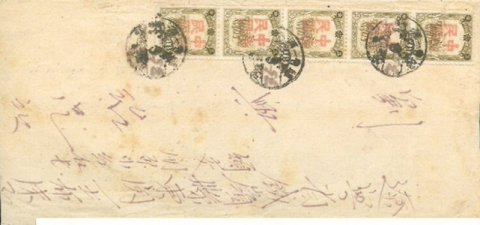 Breve med de overtrykte Manchukuo-mærker findes naturligvis også - og her kommer man rigtigt på prøve med de kinesiske skrifttegn. Dette brev er hentet fra en auktion hos amerikanske Michael Rogers.