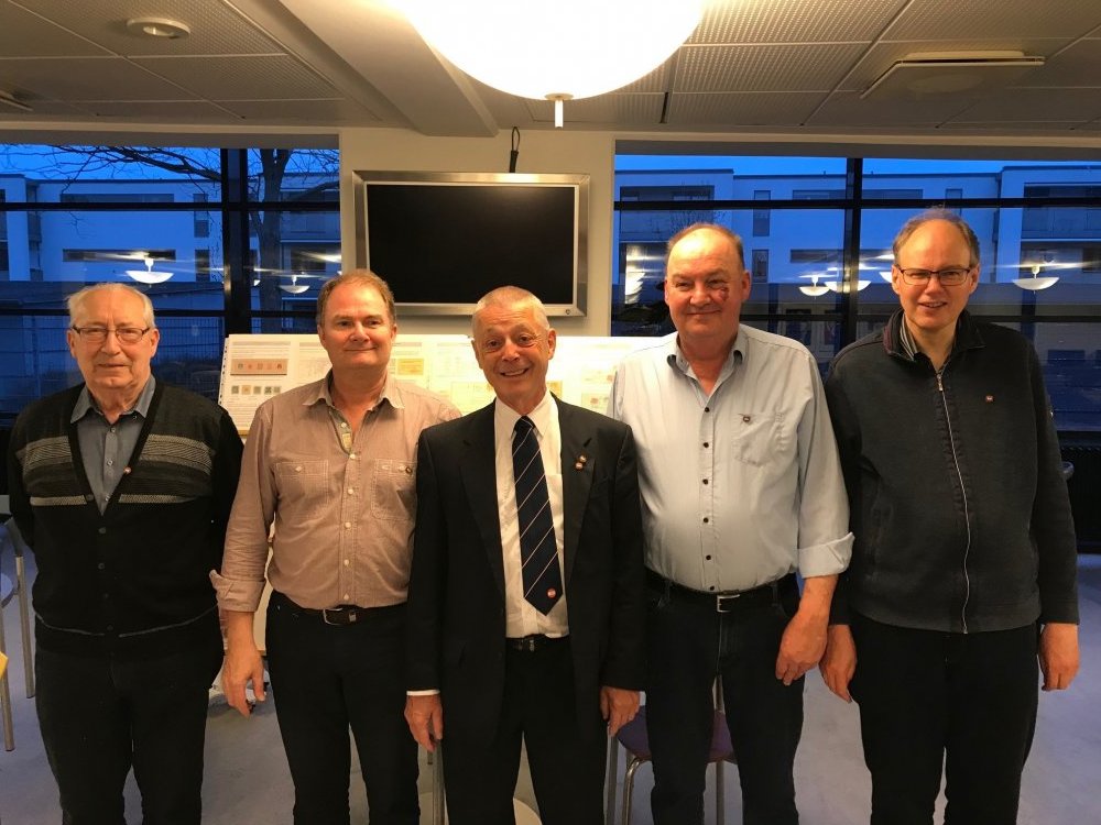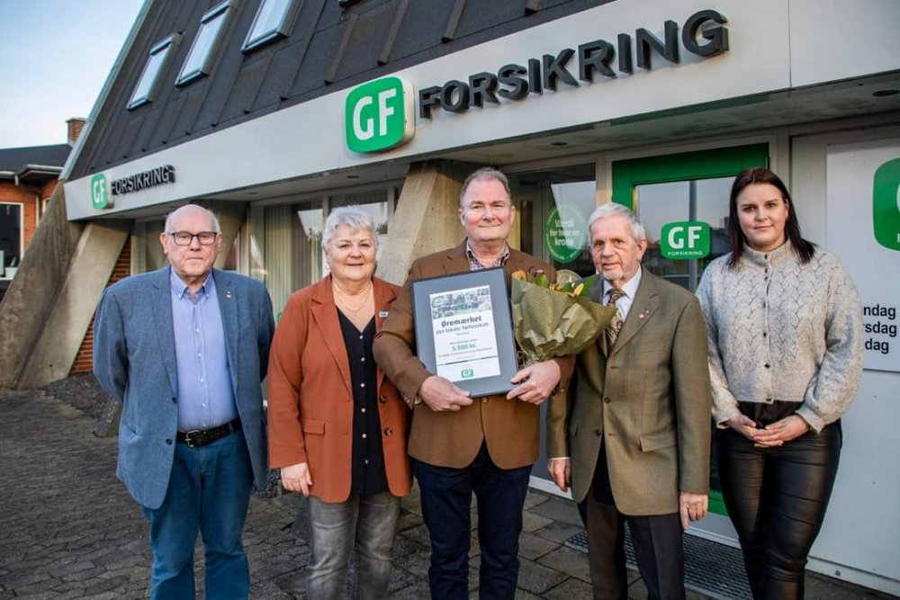 Foran GF Forsikring på Vejlevej hvor vi modtog diplom. Fra venstre mod højre: Holger Degn, Afdelingsleder Alice Lundager, Frank Miller, Arne Westenholtz og fra GF Fonden, Helle Nielsen.