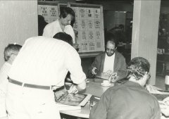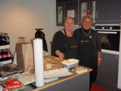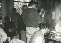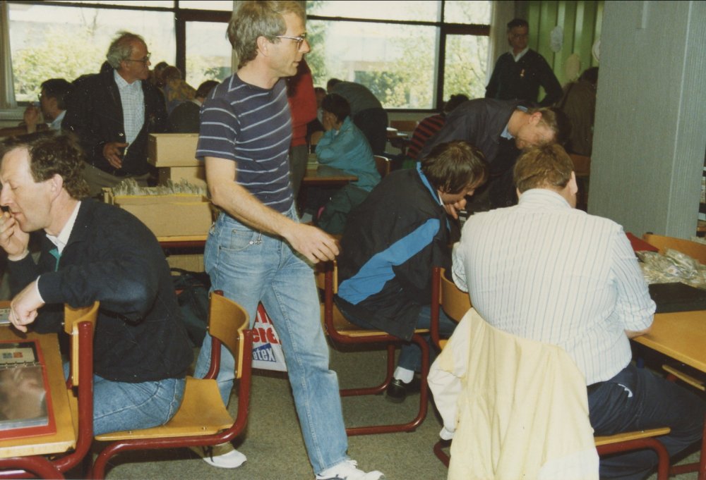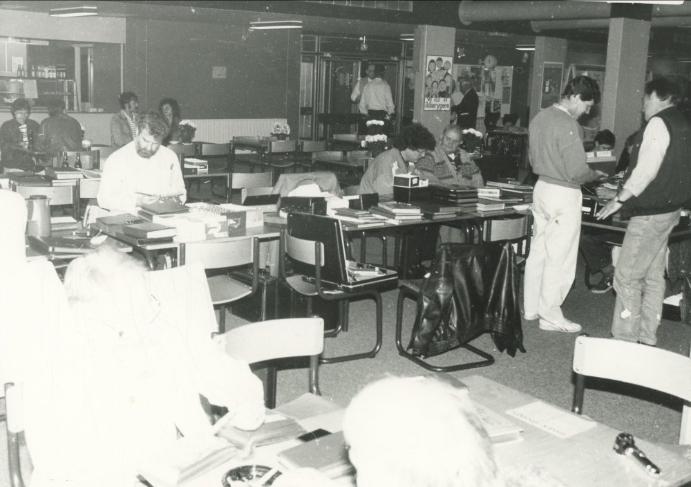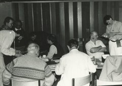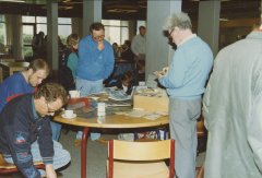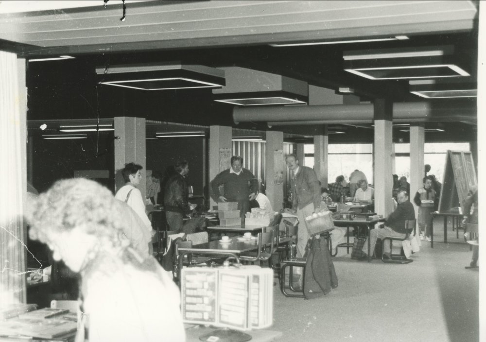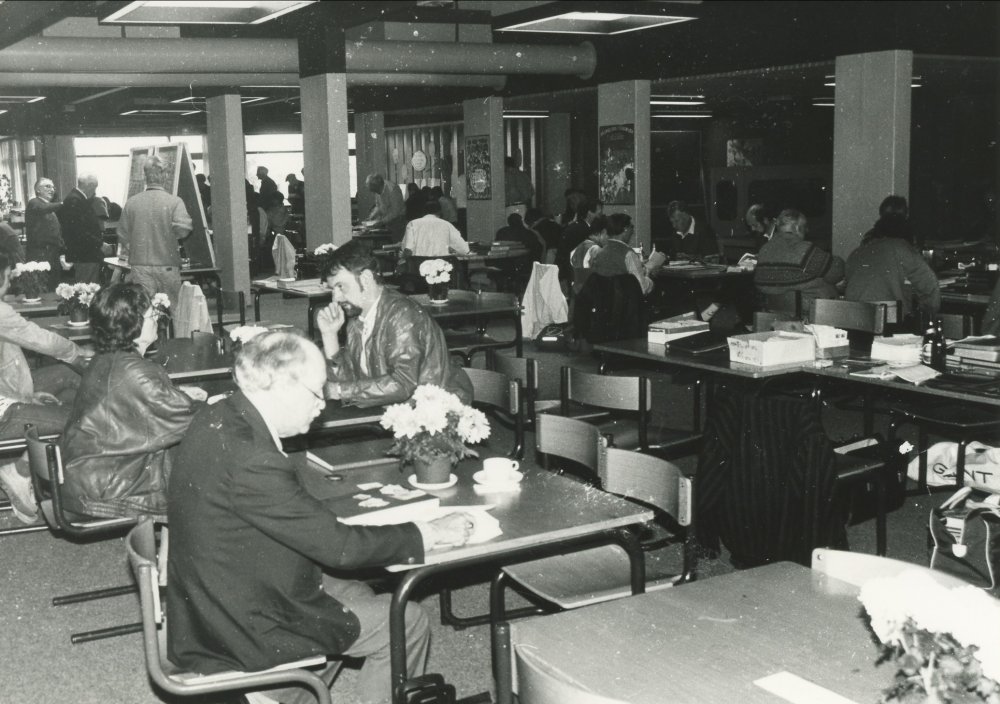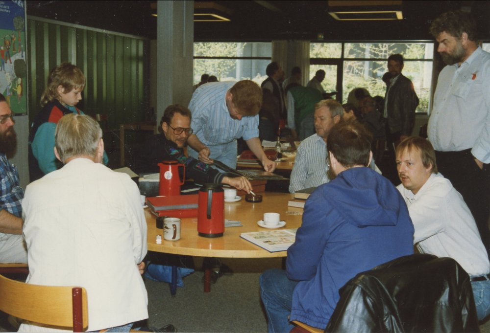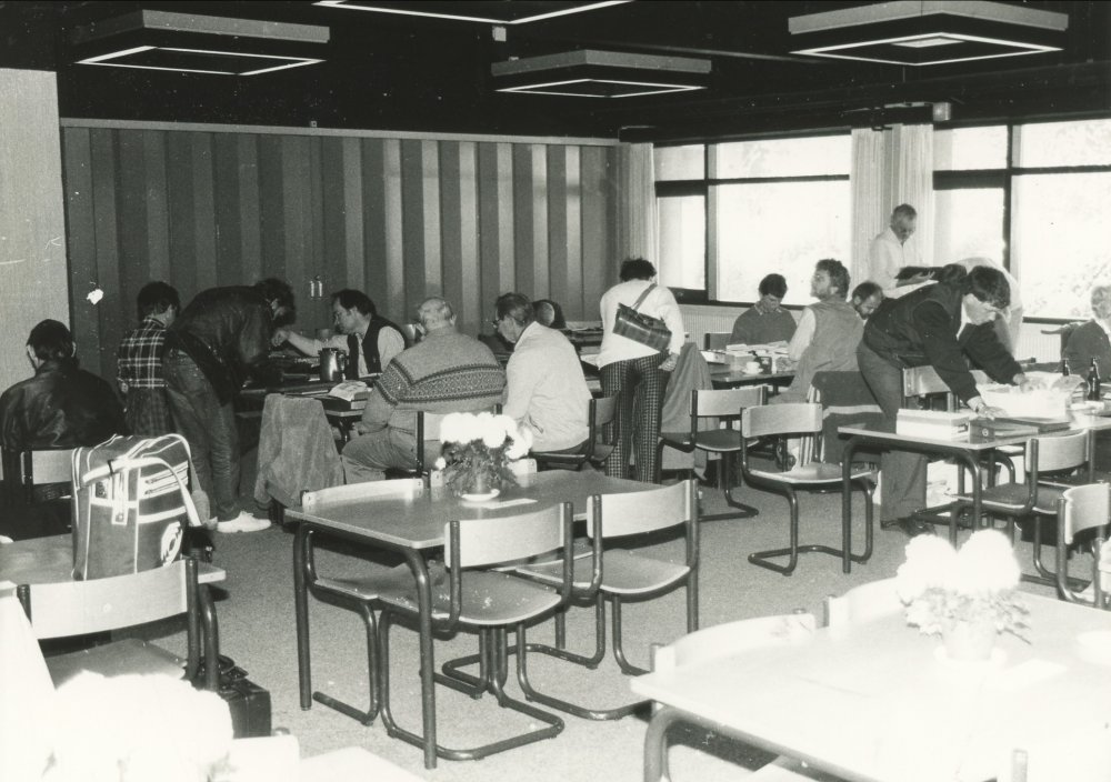 Cafeteriet Beldot med super god mad og betjening. Frank Miller og Henrik Plovst ses stående til venstre og Henning Frederiksen og Kent Boesen ses til højre siddende ved et bord.