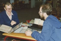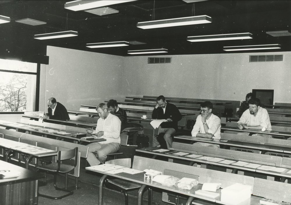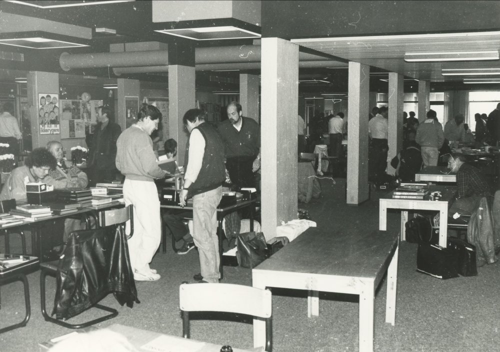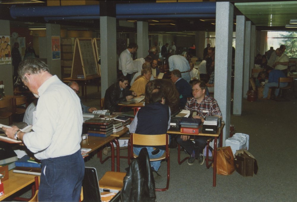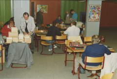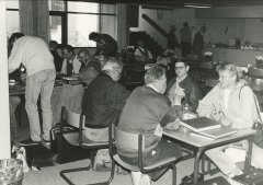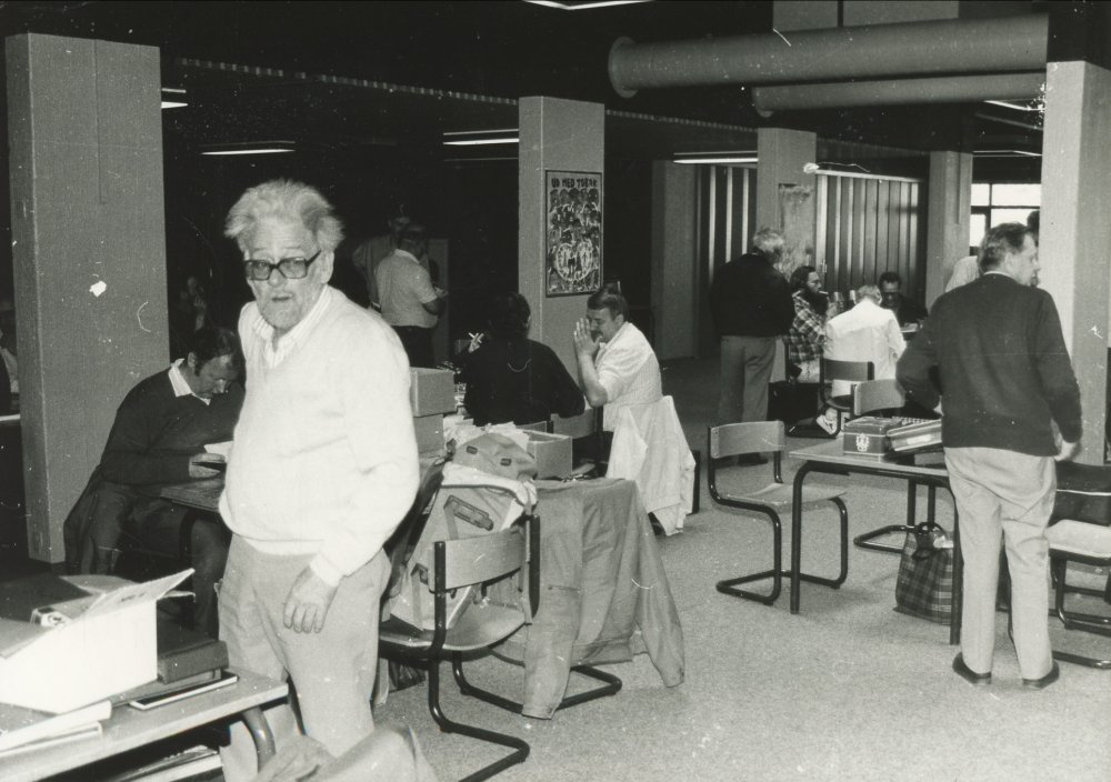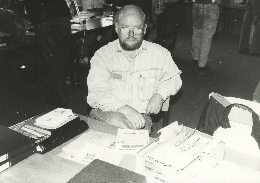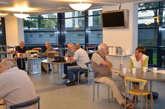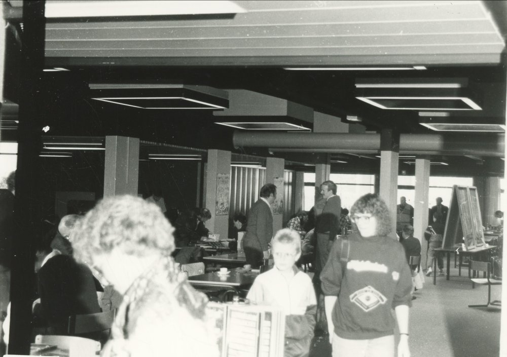 Cafeteriet Beldot med super god mad og betjening. Frank Miller og Henrik Plovst ses stående til venstre og Henning Frederiksen og Kent Boesen ses til højre siddende ved et bord.