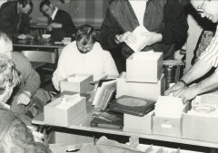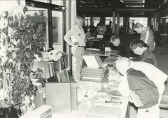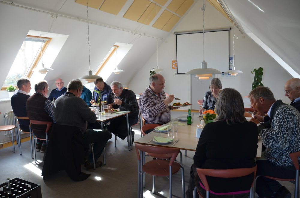 Arbejdsholdet får en velfortjent hvil samt pizza. Børge Laursen ses yderst til [...]venstre og Susanne Nielsen stående.
