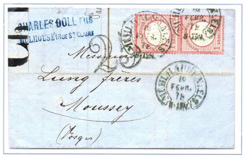 De tyske (preussiske) tropper havde i løbet af 1870 under den fransk-tyske krig besat Alsace-Lorraine og straks indlemmet det i det tyske rige som Elsass-Lothringen. Det franske postvæsen kunne naturligvis ikke anerkende dette røveri, så breve fra dette område skulle være frankeret efter de franske indenrigske takster og selvfølgelig være frigjorte med franske frimærker. Det var naturligvis ikke ubekendt for mange i området, og da der fandtes en del franske frimærker i cirkulation, fik vi dobbeltfrankeringerne.
