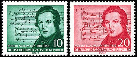 Komponisten Robert Schumann døde den 29. juli 1856, og både det vest- og det østtyske postvæsen udgav frimærker 100 år senere. Begge steder var motivet et portræt af komponisten med nogle noder som baggrund.